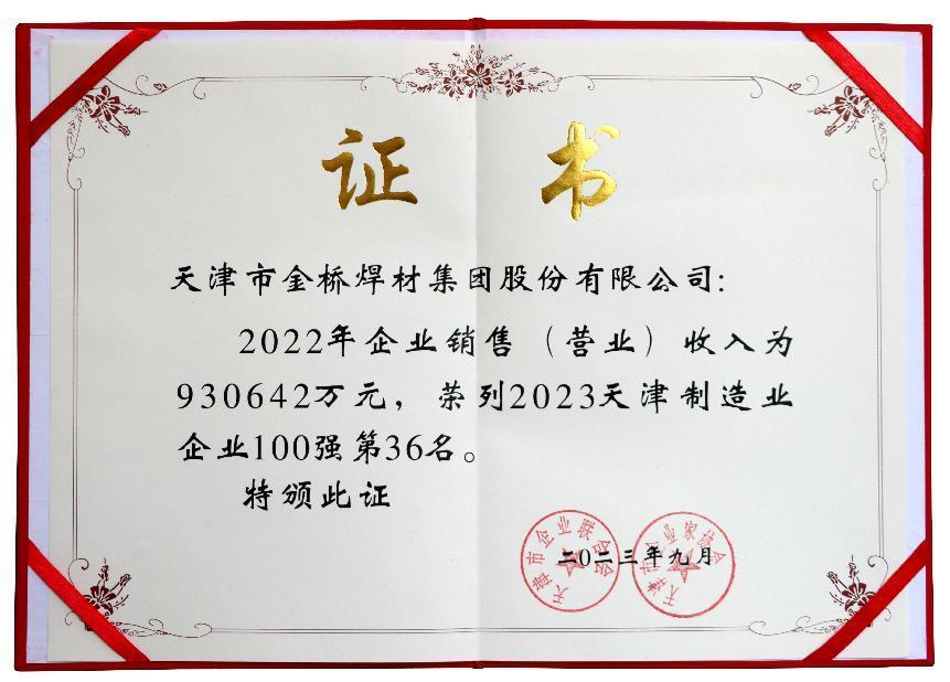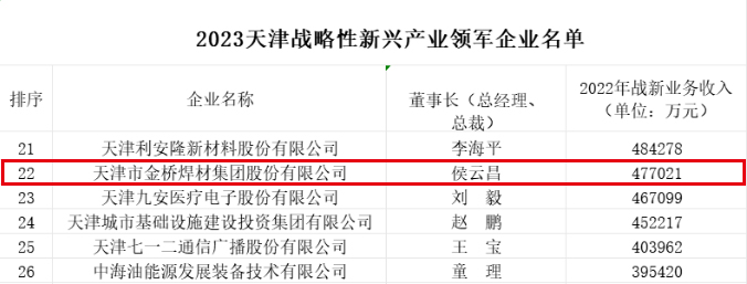 2023年,金橋焊材集團(tuán)守正創(chuàng)新,拼搏進(jìn)取,高質(zhì)量發(fā)展態(tài)勢持續(xù)向好,再次入選天津企業(yè)100強(86名)和天津制造業(yè)100強(36名),天津戰(zhàn)略性新興產(chǎn)業(yè)領(lǐng)軍企業(yè)22名。